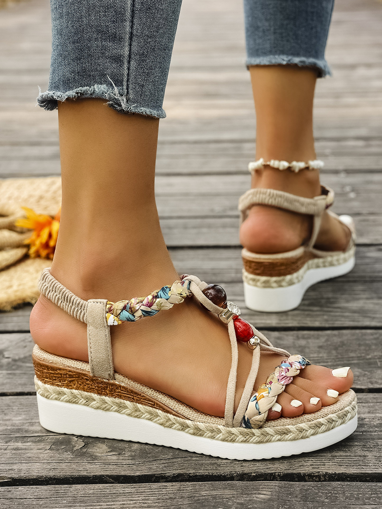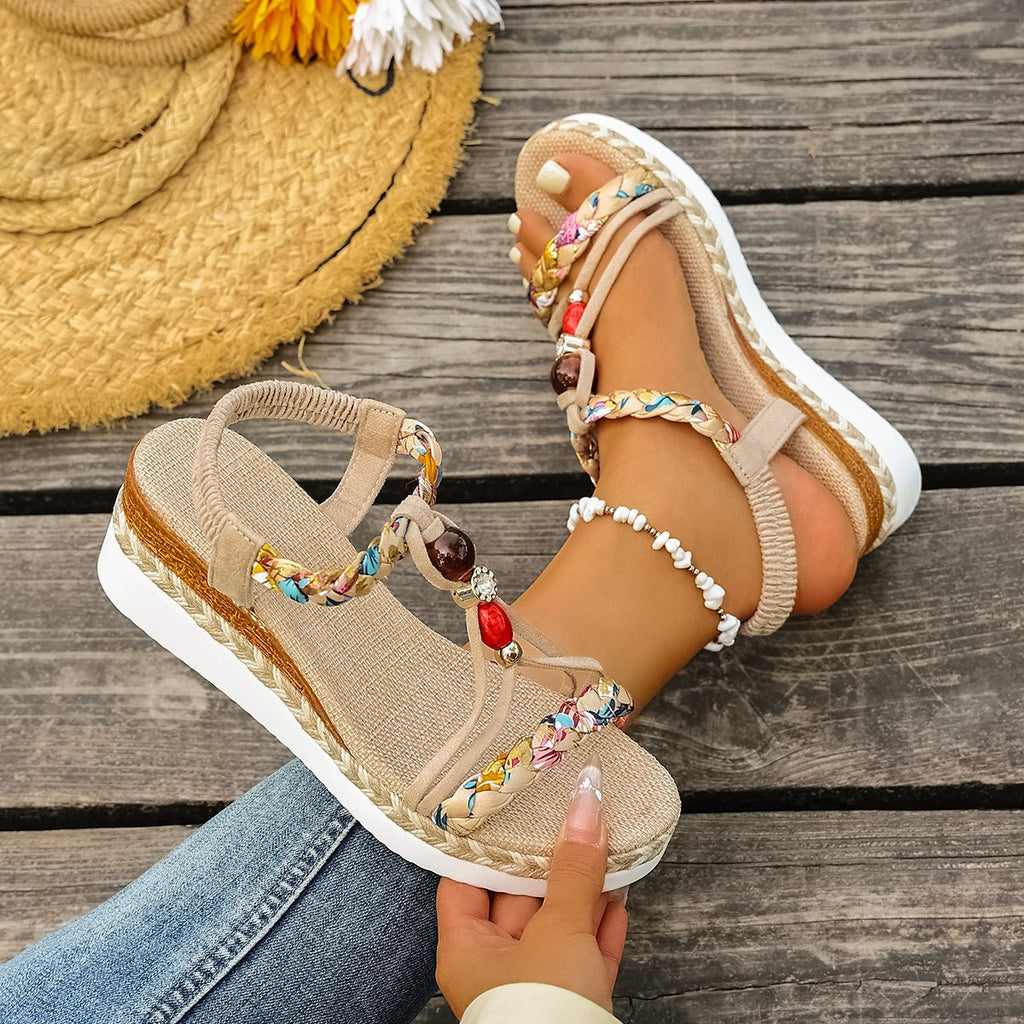 Features: Peep-toe design, elastic band closure, platform heel, Bohemian casual ethnic style