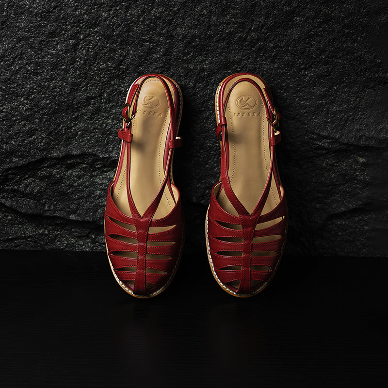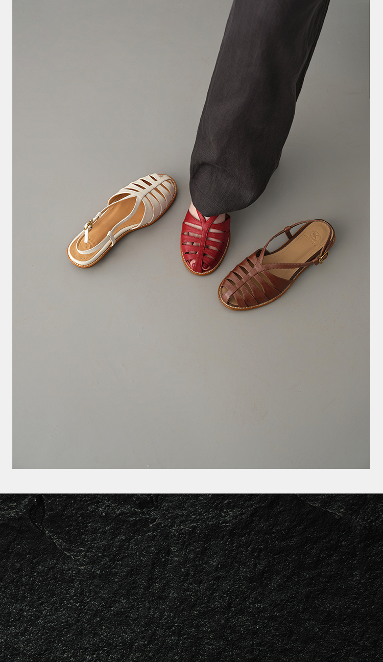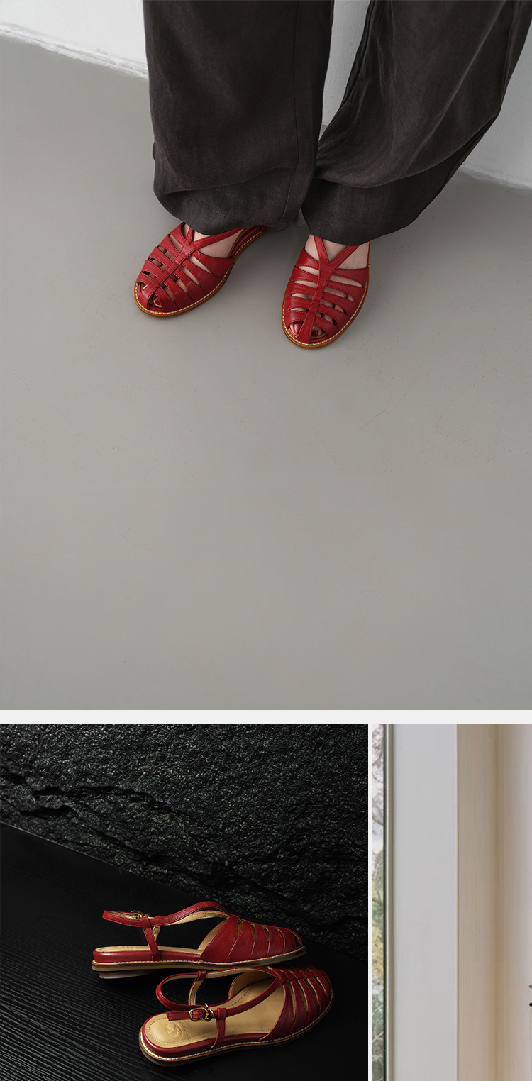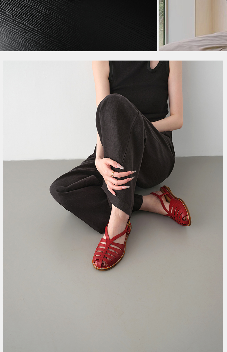 Available in classic red, white, and brown tones, these retro sandals pair effortlessly with linen jumpsuits, jeans, dresses, and wide-leg trousers. They transition seamlessly from casual weekend wear to smart casual office outfits, embodying quiet luxury and timeless style.