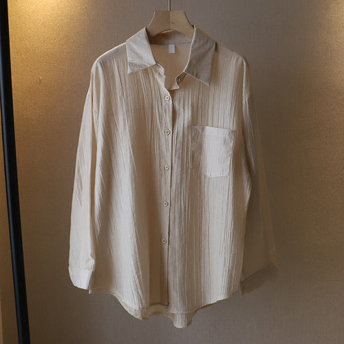 Loose Cotton And Linen Long Sleeve Women's Pleated Lapel Shirt