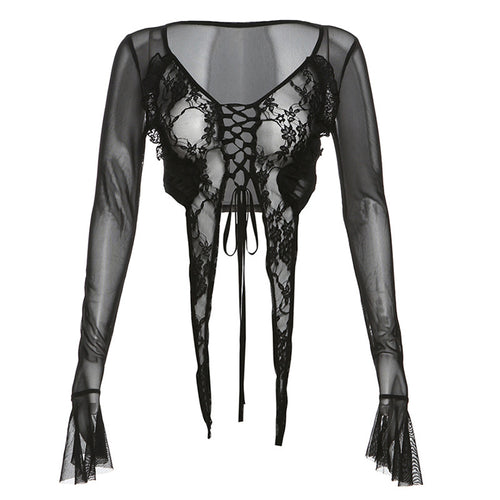 Cross V-neck Lace-up Waist-controlled Mesh See-through Hooded Top