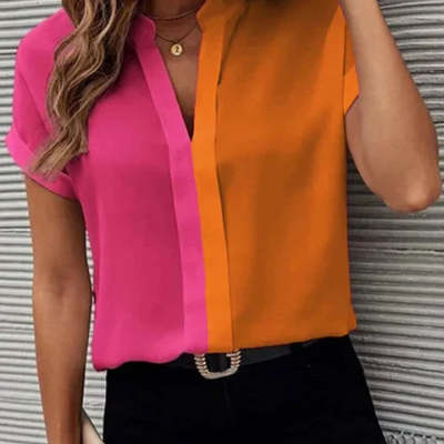 Women's Summer V-neck Color-block Short-sleeved Shirt