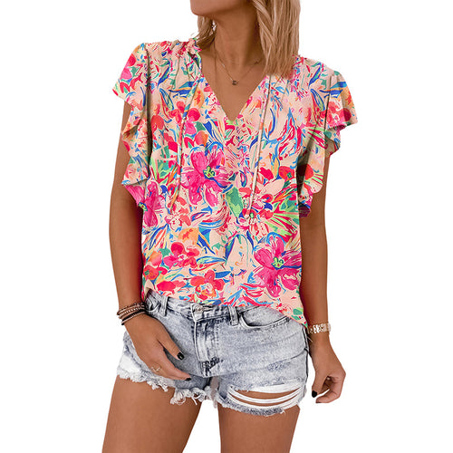 Women's Thin V-neck Ruffled Printed Short-sleeved Shirt