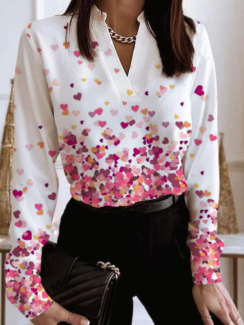Women's Casual Long-sleeved V-neck Heart Printing Shirt