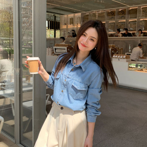 Retro Pleated Lapel Breasted Slim Fit Denim Shirt For Women