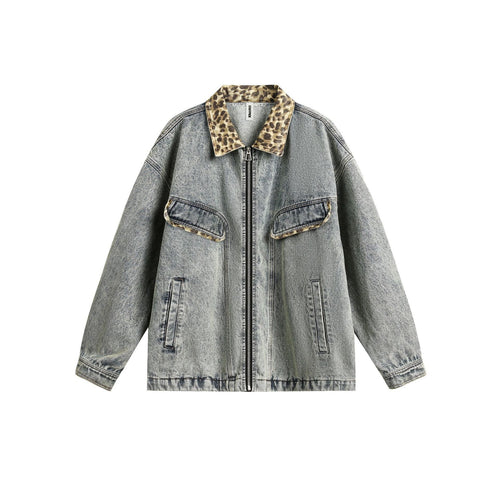 American-style Retro Street Washed Leopard Print Lapel Denim Jacket