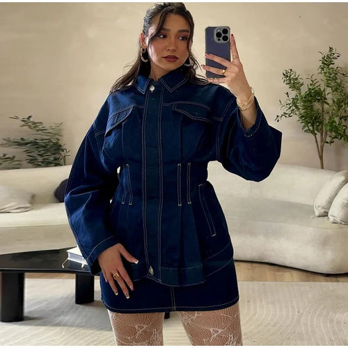 Women's Fashion Waist-Cinching Fake Two-Piece Long Sleeve Denim Jacket