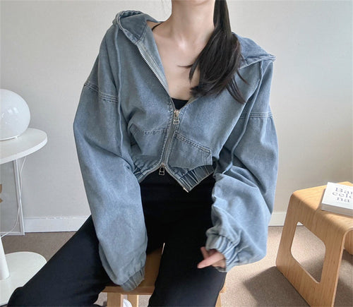 Casual Cool Girl Retro Hooded Drawstring Windproof Denim Jacket Coat