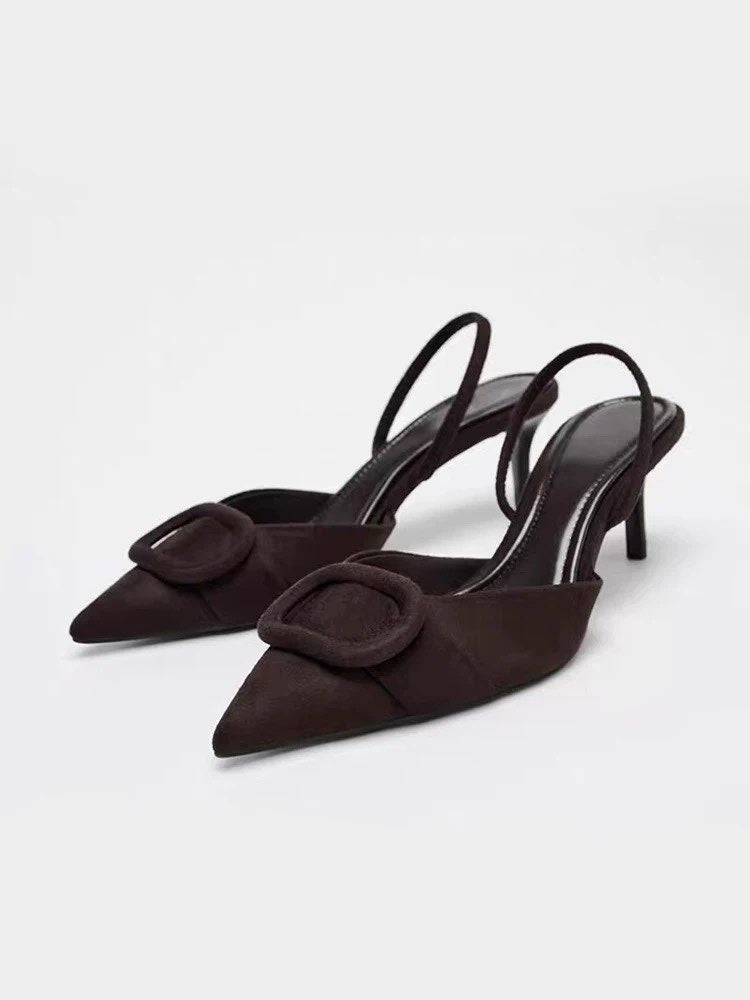 2026 Spring New Arrival Women's Square Buckle Pointed Toe High Heels, Closed Toe Backless Mules Sandals In Brown