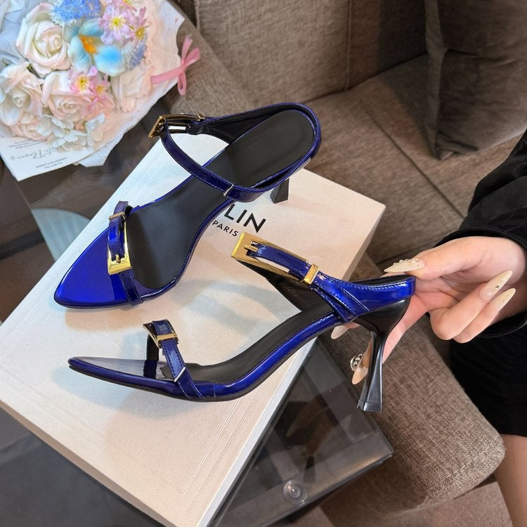 Elevate your evening look with these chic French-inspired stiletto sandals. Featuring a sleek pointed toe, a slender high heel, and a bold gold-tone metal buckle accent, these one-strap sandals blend modern sophistication with timeless allure. The glossy patent leather finish adds a luxurious touch, making them perfect for pairing with dresses, skirts, or tailored outfits for parties, dates, or special occasions.
