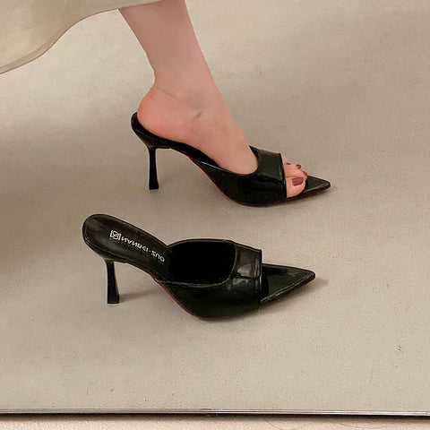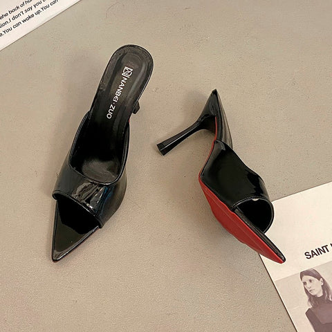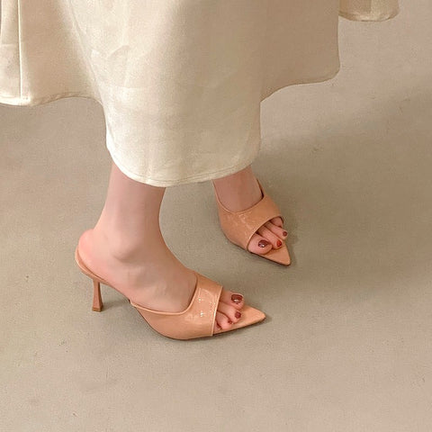 Elevate your summer style with these women's slip-on heeled sandals. Designed with a sleek pointed toe, glossy patent leather upper, and a flattering slender heel, they offer a sexy, elegant look that visually lengthens your legs for a slim effect. The easy slip‑on design and classic black and apricot shades make them versatile for daily wear, parties, dates, and all outdoor occasions.