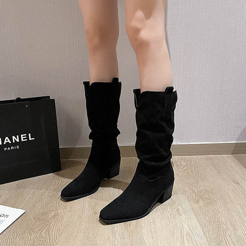 Women's Suede Pointed Chunky Heel Pile Style Long Biker Boots