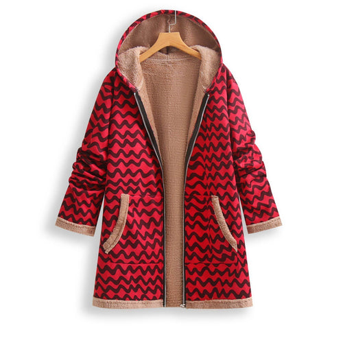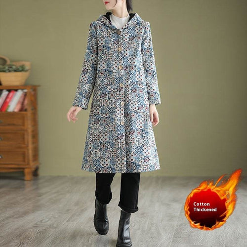 Ethnic Style Fleece-lined Thick Mid-length Hooded Jacket