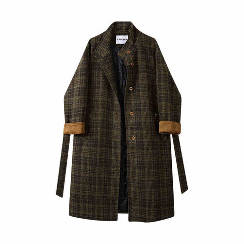 Cotton Padded Thickened Long Retro Stand Collar Checked Woolen Coat Women