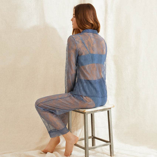 European And American Lace See-through Dress Long-sleeved Lapel Sexy Sexy Net Gauze Pajamas Women