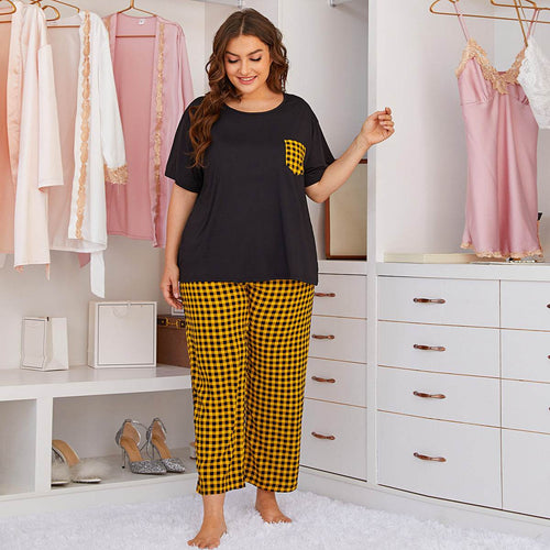 Home Service Plaid Round Neck Short-sleeved Trousers Home Suit Pajamas Women