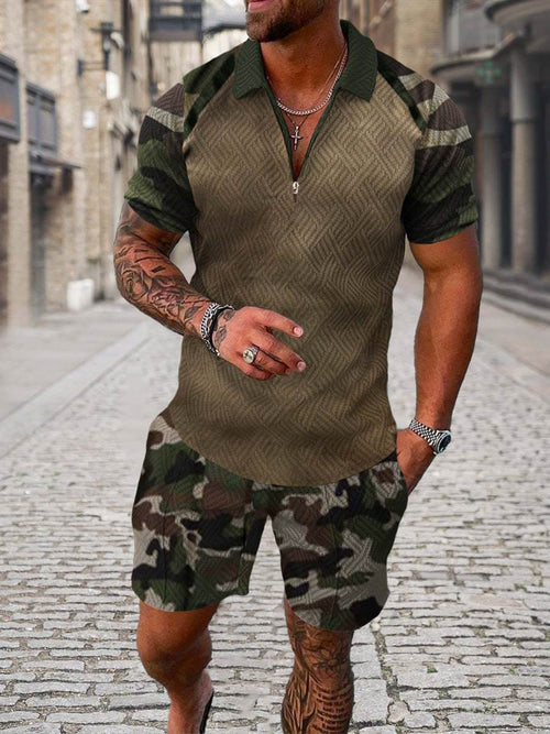 Men's Summer Fashion 3D Printed Short Sleeve Geometric Zip Lapel Shirt Set