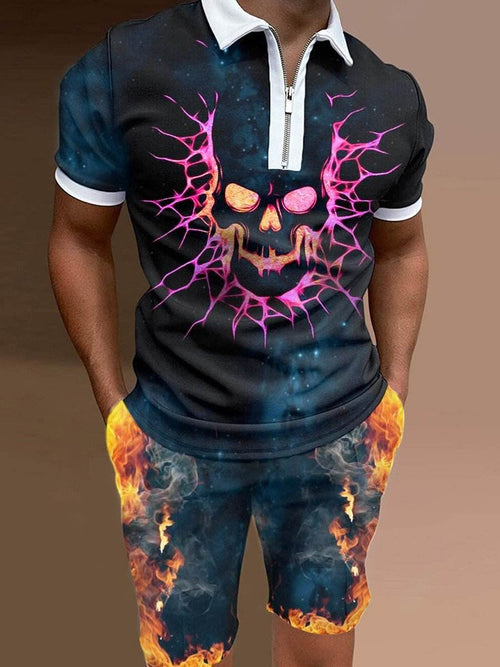 Men's Summer Fashion 3D Printed Short Sleeve Geometric Zip Lapel Shirt Set