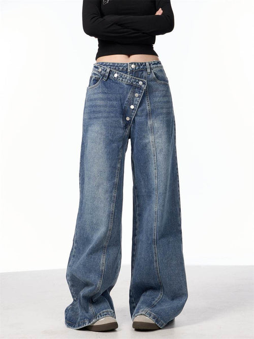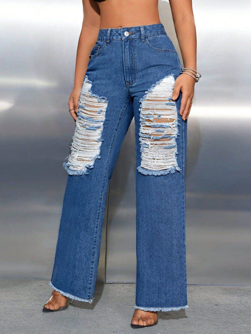 Women's Fashion Holes Decorative Mid-waist Wide-leg Jeans