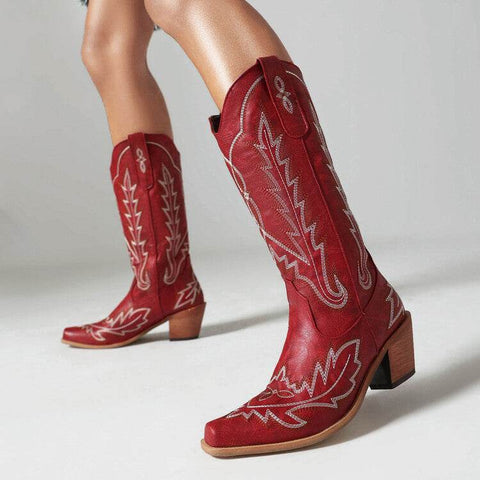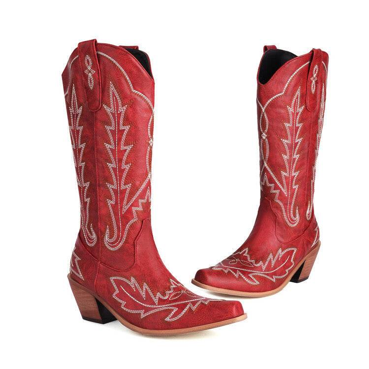 Embroidered Long Knee-high Boots Pointed Toe Chunky Heel High Heel